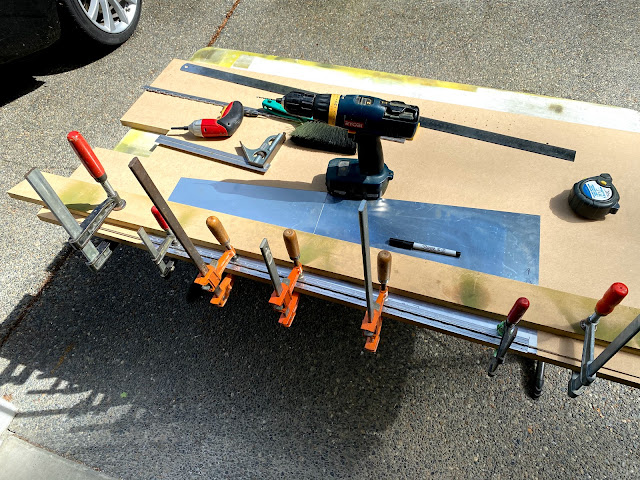 The trick here seems to be that you need the piano hinge to line up exactly the same on both sides. I accomplished this by laying both pieces of aluminum on the edge of a bench (leftover from my wing jigs). Clamped it down, and then laid the piano hinge down and drilled it in one piece over both sides - with the intent to cut it later.