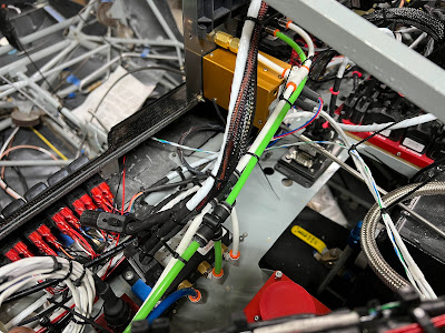 I did the bulk of my wiring with the temporary firewall in place and the engine hung. Now that all of that is out, now is the right time to clean up the mess and finish the last few connections. I am actually rewiring all of the power connections through the firewall. All of the new wires are extra long so I can route them nicely and terminate appropriately. Its only about 10 wires... a few of them I had not done yet, but those are in progress.